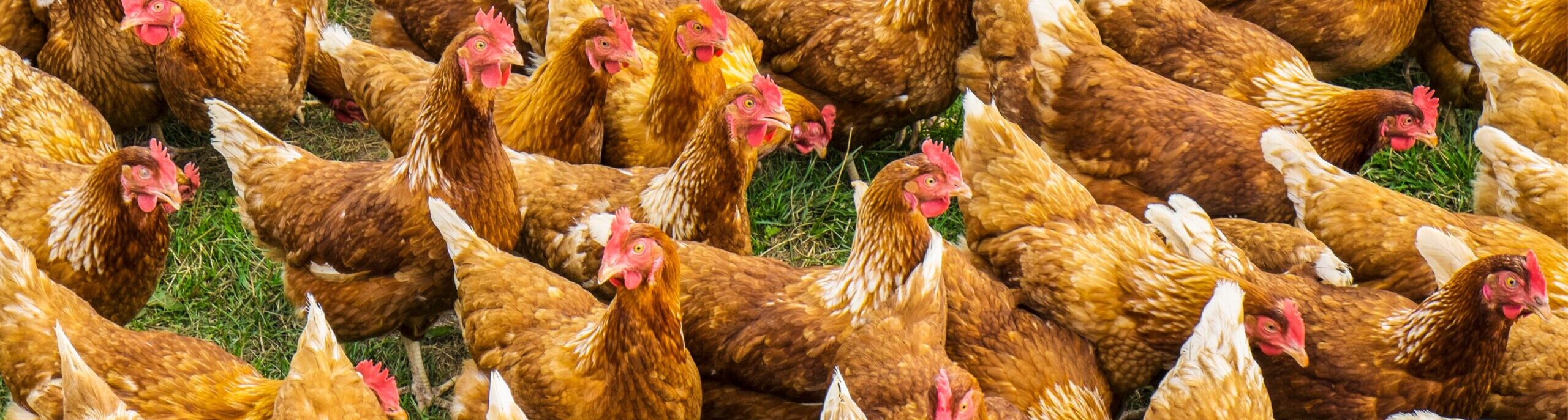 Closeup of a flock of brown chickens walking on the grass