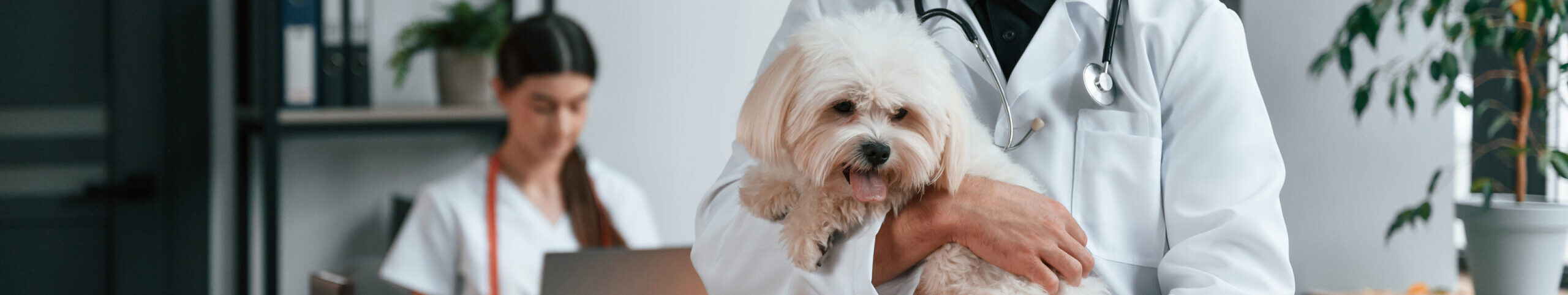 Woman is sitting by laptop. Male and female doctors are taking care of maltese dog in the clinic